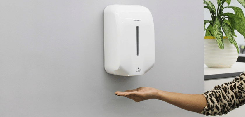 The dispenser automatically releases a controlled amount of sanitizer.